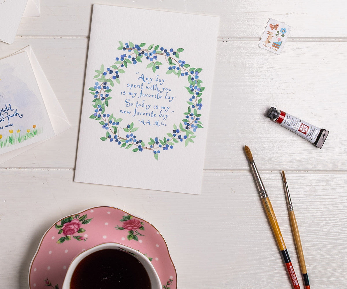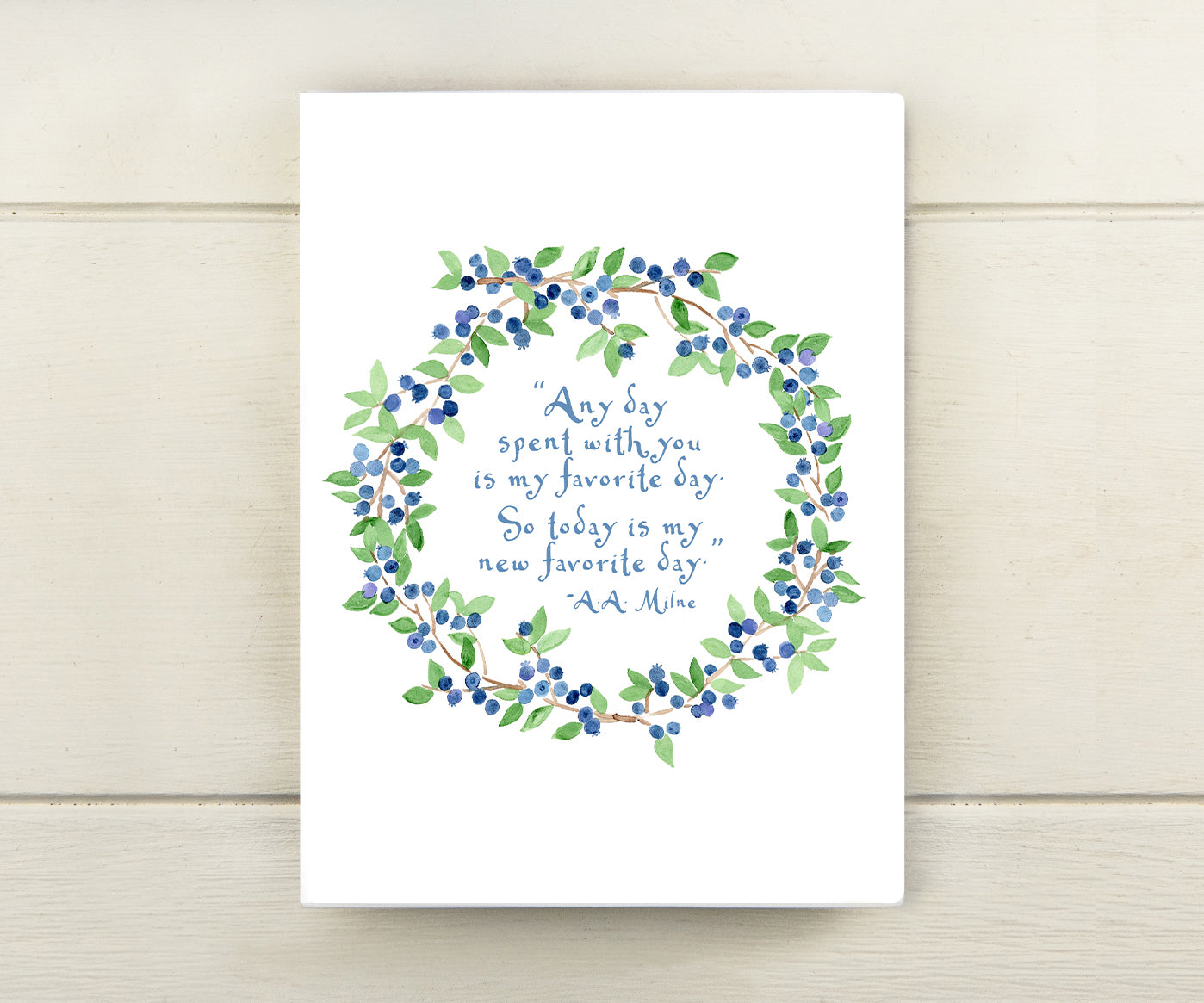 A blueberry wreath surrounds this sweet Pooh quote by A.A. Milne, “Any day spent with you is my favorite day. So today is my new favorite day.”