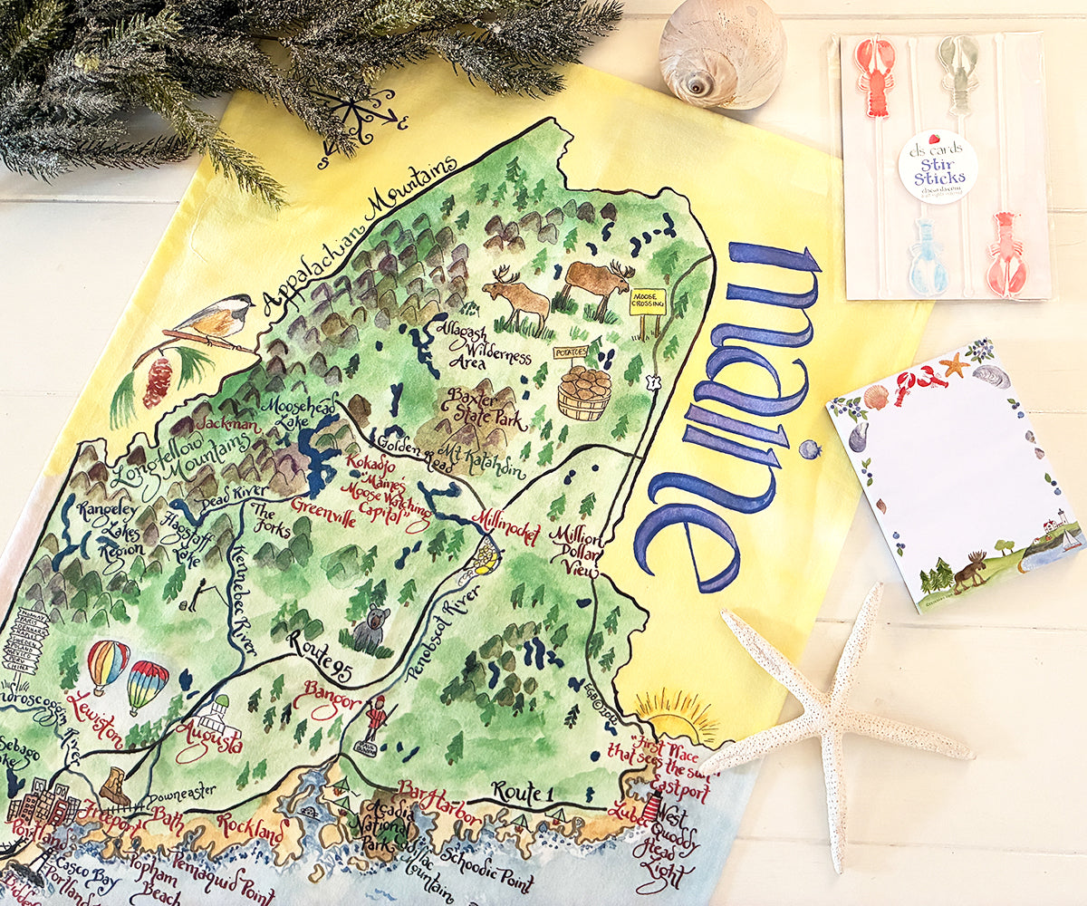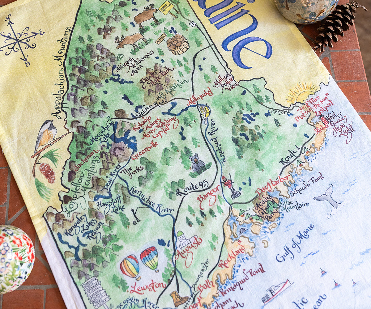 • 1 full color 100% cotton tea towel printed with our Maine map