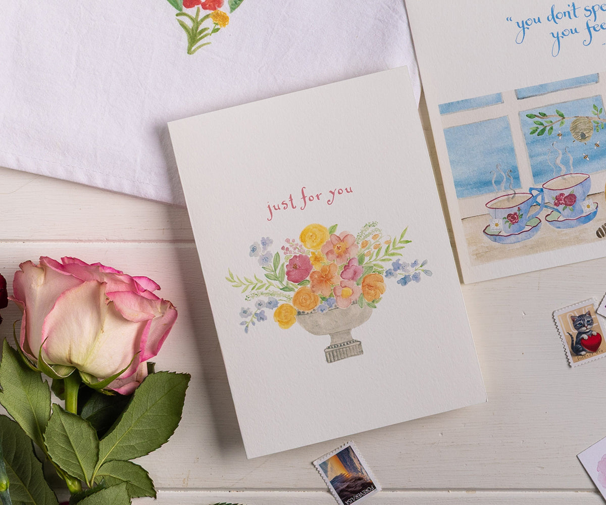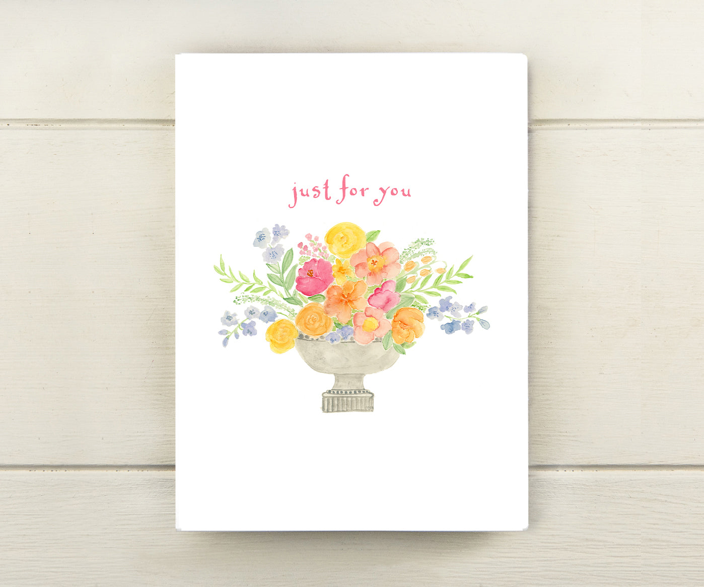 This sweet bouquet gives us English countryside garden vibes.  Simple text is "just for you".  This lovely card will surely delight the recipient.