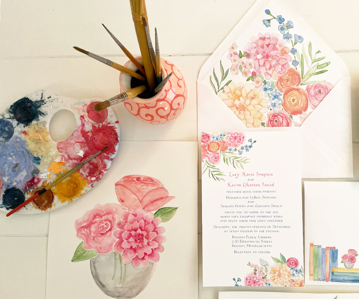 -Custom Watercolor Crests are another great option to make your wedding stationery custom. These beauties are hand painted for you especially and can be used on everything from the invitation through the thank you note. When designing the invitation and wedding day stationery, I use the elements from your crest to design all your other pieces and keep everything looking super unique. This is also a contracted item that involves timing and minimums.