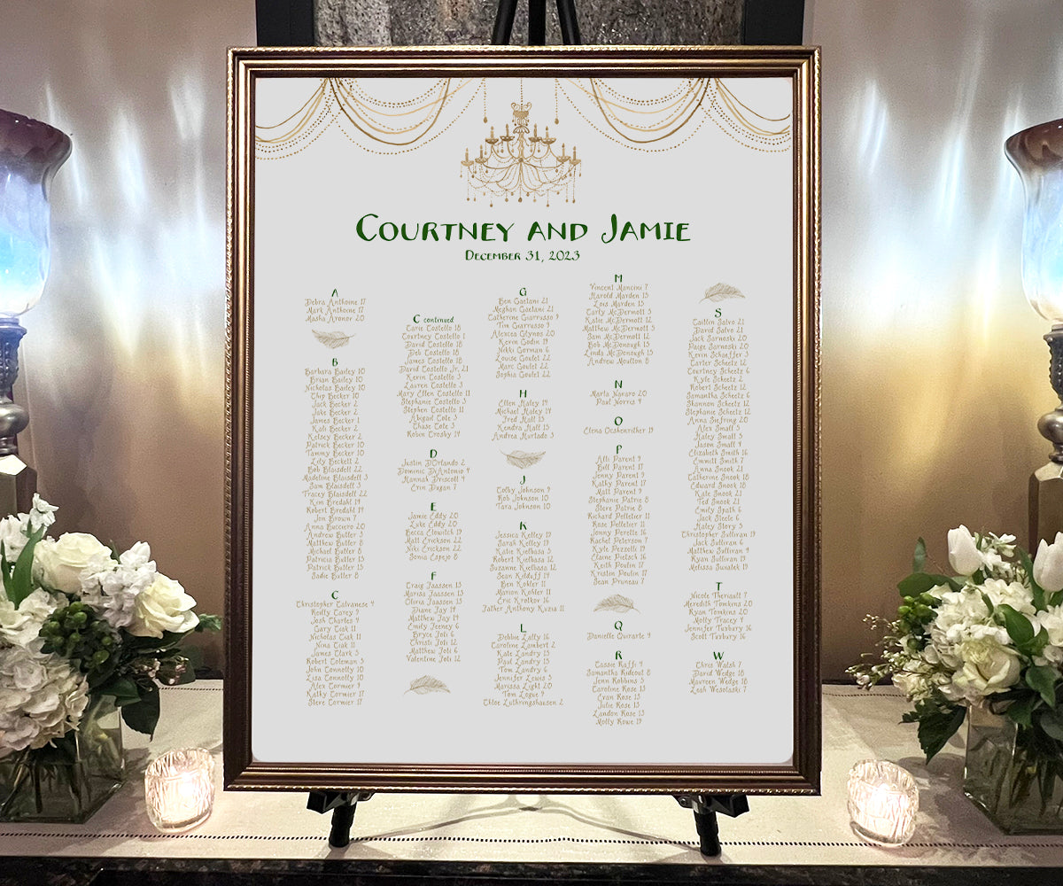 Our Hollywood Glam seating chart was originally created for a New Year's Eve wedding.  Simple elegant with a chandelier and swags, headers are in a deep green with text in soft gold.  It's a beautiful addition to your wedding reception.  Then after the wedding, you can keep this lovely seating chart as a piece of artwork to remember who was there to celebrate.