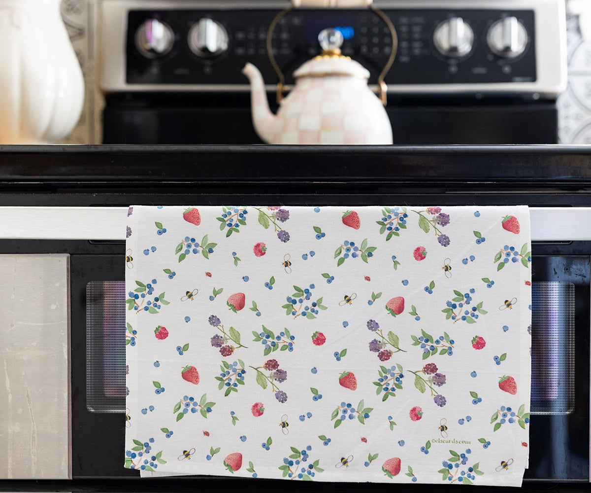 Our favorite berries, bees, and ladybugs are the whimsical elements on this sweet new tea towel.  Enjoy all the great colors and pretty watercolors-blueberries, raspberries, strawberries, and blackberries complement each other beautifully.