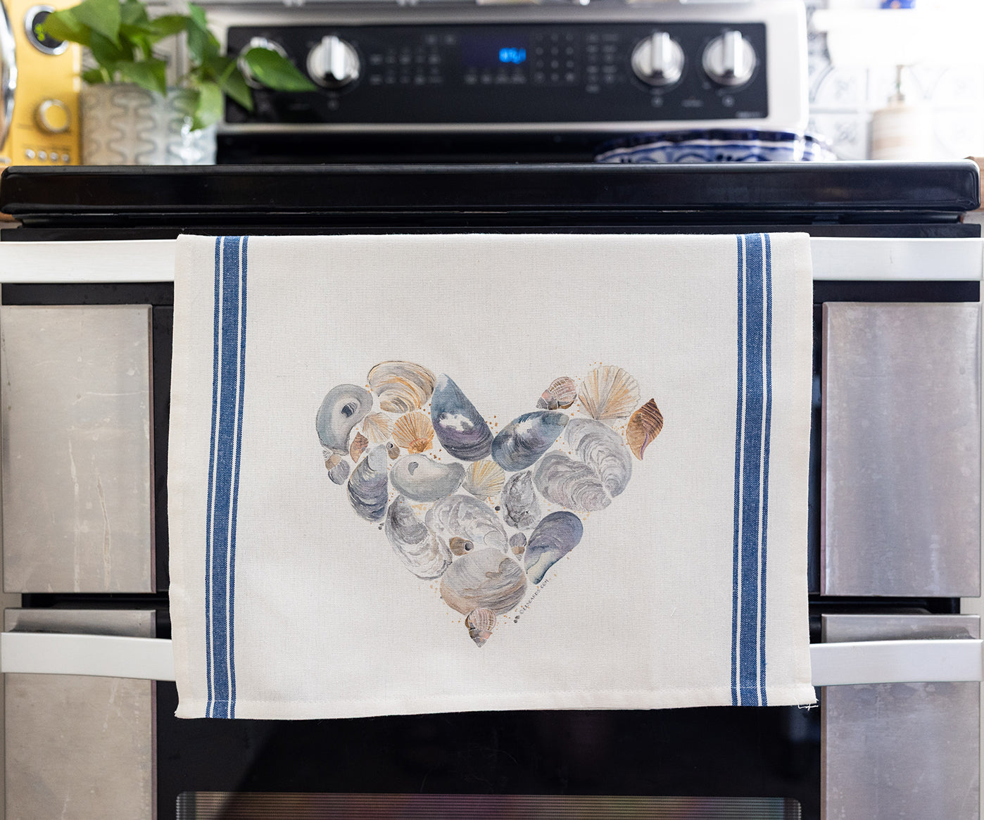 Shell Heart is a great design for this vintage style blue striped tea towel.  Great for use any time of year-beach lovers...this one's for you!  Featuring mussel and oyster shells, periwinkles and scallop shells, the blue stripes on the side give this towel a vintage feel.