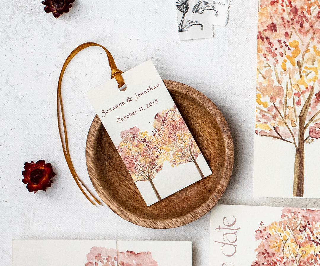 Honor your guests with a favor at the wedding. Wedding favors can be anything you imagine and are a great way to show your guests you appreciate their attendance at your special day. Our favor tags are also popular for wedding showers and to put on welcome bags. There is space for you to personalize them with your names, wedding date, and sometimes a little note! These watercolor tags are created to accompany our wedding suites, but it's fun to mix and match too! All designs are hand painted by El and printed by Bob in our New Hampshire studio. The ribbon is a perfect color accent! Have fun selecting your tags...lots of choices!