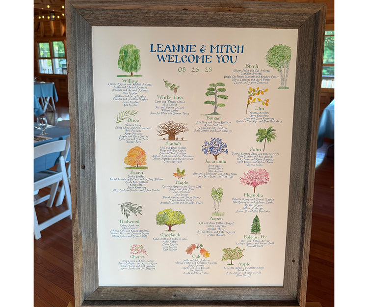 This couple's creative table names were the basis for their seating chart. El found trees or foliage illustrations from her extensive existing designs, and made this chart personal for Leanne and Mitch.