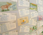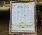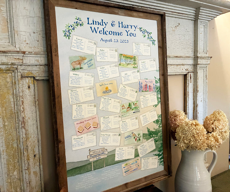 This fun postcard chart was for a Maine summer camp wedding! All of the tables are named for the different cabins, and there are colorful postcards included throughout. Lindy and Harry's Lake View wedding invitation was the original inspiration for the chart, as seen in the background.