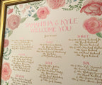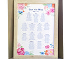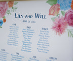 This colorful floral seating chart featured flowers selected by the bride. We love the mix of designs in all 4 corners. See all the items we did in Lily and Will's wedding gallery page. Photo by Sarah Bastille.