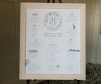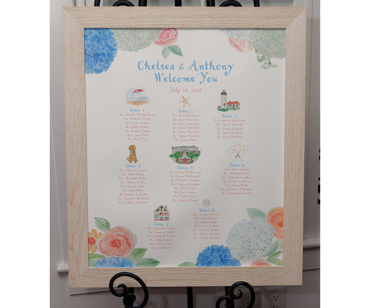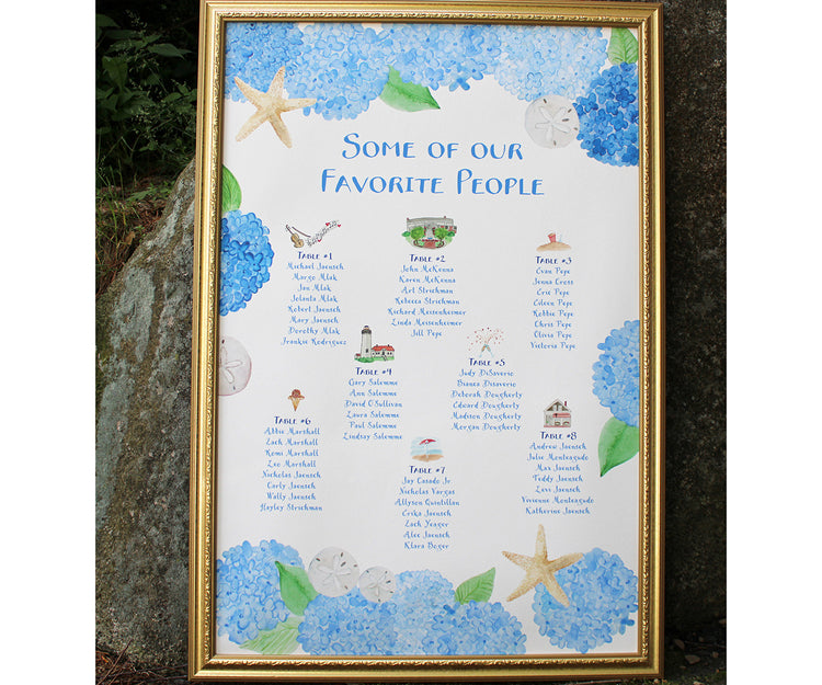 This Blue Beach Hydrangea Seating chart is oversized (24" x 36") and many of the illustration accents came from the couple's custom wedding map.