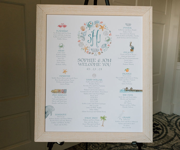 More creative table names! Sophie and Jon worked with us on everything starting with their save the dates. This seating chart featured their monogram using our Sea Wreath design, and tables were named for elements on their Naples, FL map. See their stunning full gallery by Madeline Paige.