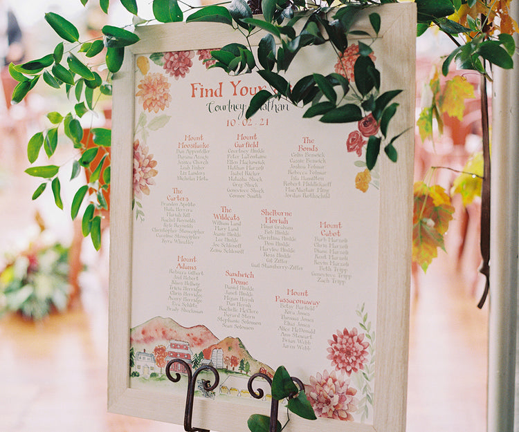 This seating chart for an autumn wedding had artwork taken from the couple's custom map and flowers from their invitation, Autumn Bouquet. Custom Table names are featured here too. You can see all their lovely wedding details in their wedding gallery-photo by Kate Preftakes.
