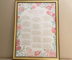 Detail of Peony Bouquet chart with hand calligraphy in shimmery gold ink for names and a beautiful pearly pink ink for the headers on their chart.