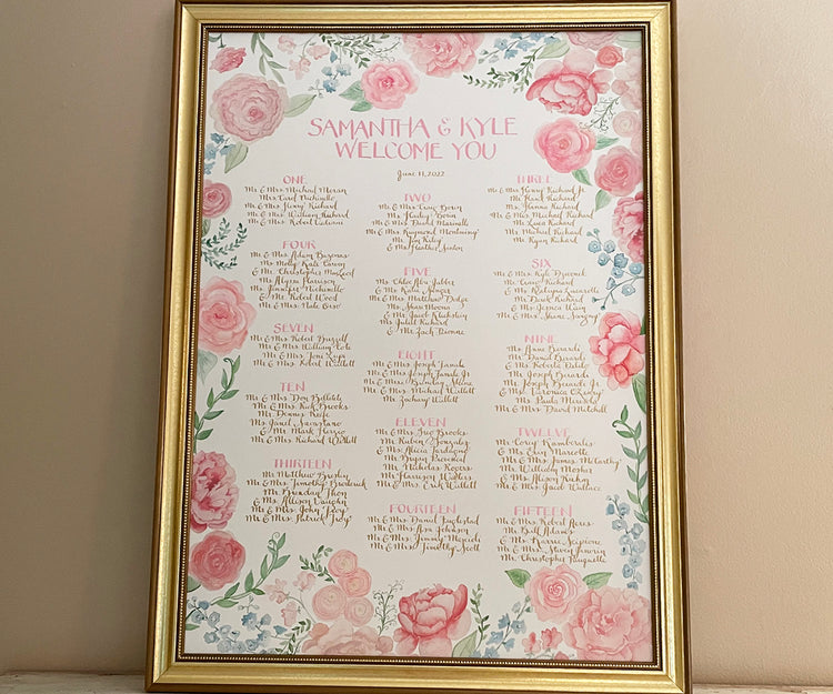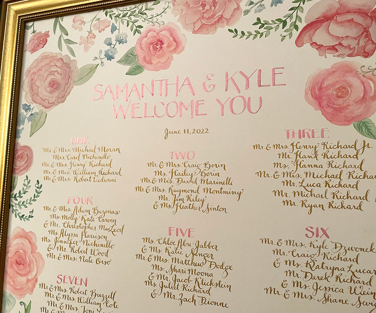 This couple had their heart set on hand calligraphy, but loved the artwork from their Peony Bouquet invitation suite. The floral border was printed, then all guest names and headers were written in hand calligraphy.